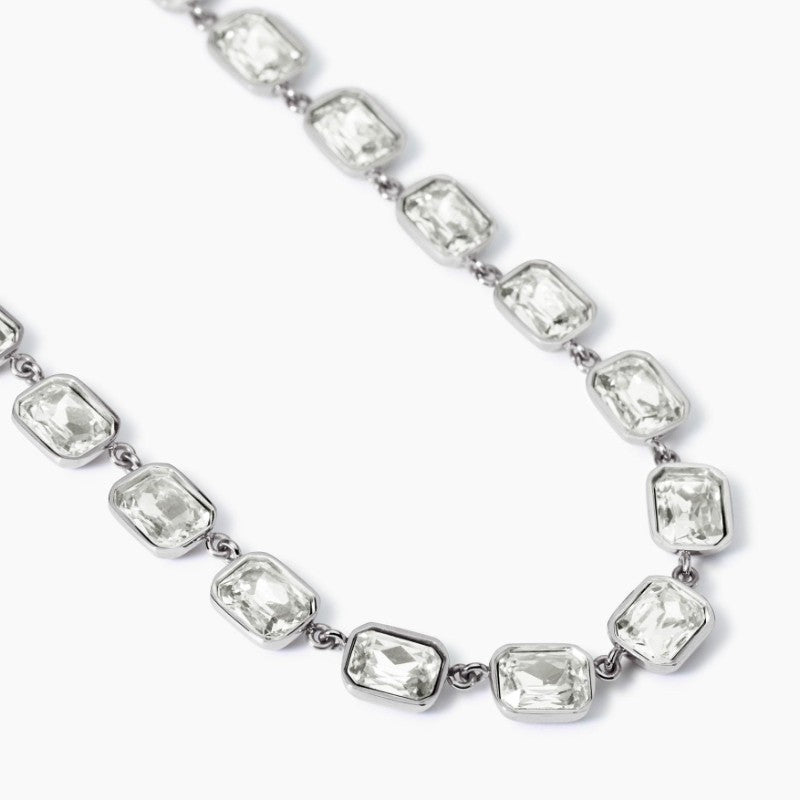 Girocollo regolabile con cristalli ottagonali bianchi taglio grande collezione Style. Diametro cristalli tondi: 3 mm. Dimensione cristalli ottagonali: 10 x 8 mm. Misura regolabile, lunghezza da 39 a 42,5 cm. Materiale: Acciaio 316L, Cristalli.