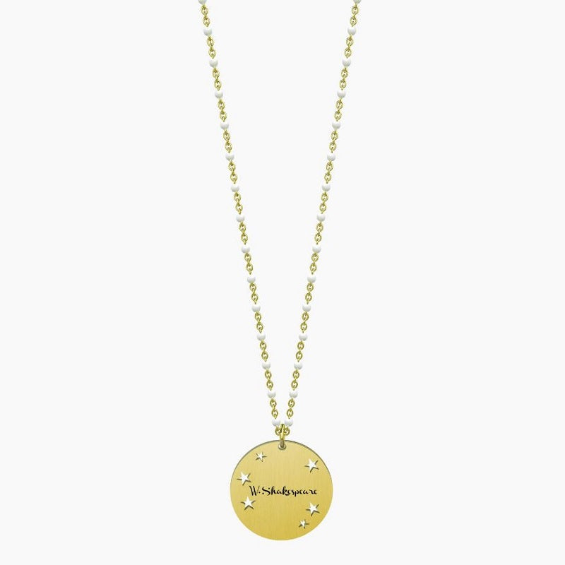 Collana lunga in acciaio color oro con ciondolo satinato tondo e catena rolò con inserimenti in smalto bianco. Collecione Philosophy. Incisione smaltata sul ciondolo e inserimenti in smalto sulla catena. Chiusura con moschettone. Misura unica, lunghezza 80 cm. Materiale: Acciaio 316L con Pvd Oro, Smalto.