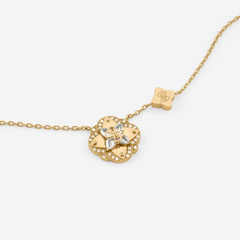 Collana da donna in acciaio dorato e cristalli Guess. Struttura a catena regolabile. Ciondolo centrale a forma di fiore. Applicazione di cristalli e zirconi cubici. Dettaglio del logo 4G. Chiusura a moschettone. Lunghezza totale da 40,7 a 45,7 cm.