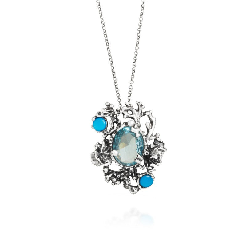 Collana pendente da donna in Argento 925 oceano Giovanni Raspini. Argento 925, grande quarzo celeste e madreperle doppiate con agata azzurra. Lunghezza catena 80 cm. Lunghezza pendente 4,9 cm. Chiusura con moschettone. Fatto a mano in Italia.