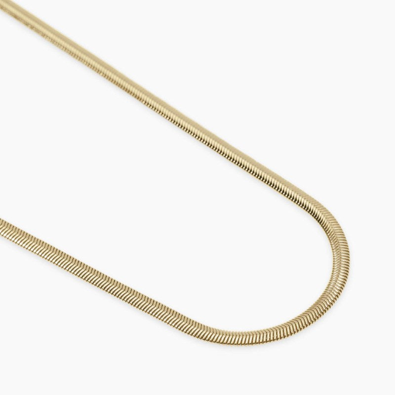 Collana in acciaio dorato con catena snake. Collezione style 09. Larghezza catena: 4 mm. Misura unica, lunghezza 50 cm. Materiale: Acciaio 316L, PVD giallo.