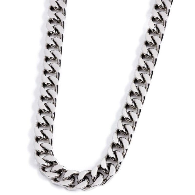 Collana da uomo in acciaio catena grumetta Marlù. Metallo in acciaio inossidabile, colore silver, anallergico. Catena maglia grumetta piatta grandezza maglia 12 mm con doppio moschettone con texture bugnata e logo Marlù inciso. Lunghezza collana 55 cm regolabile tramite secondo moschettone Marlù removibile.
