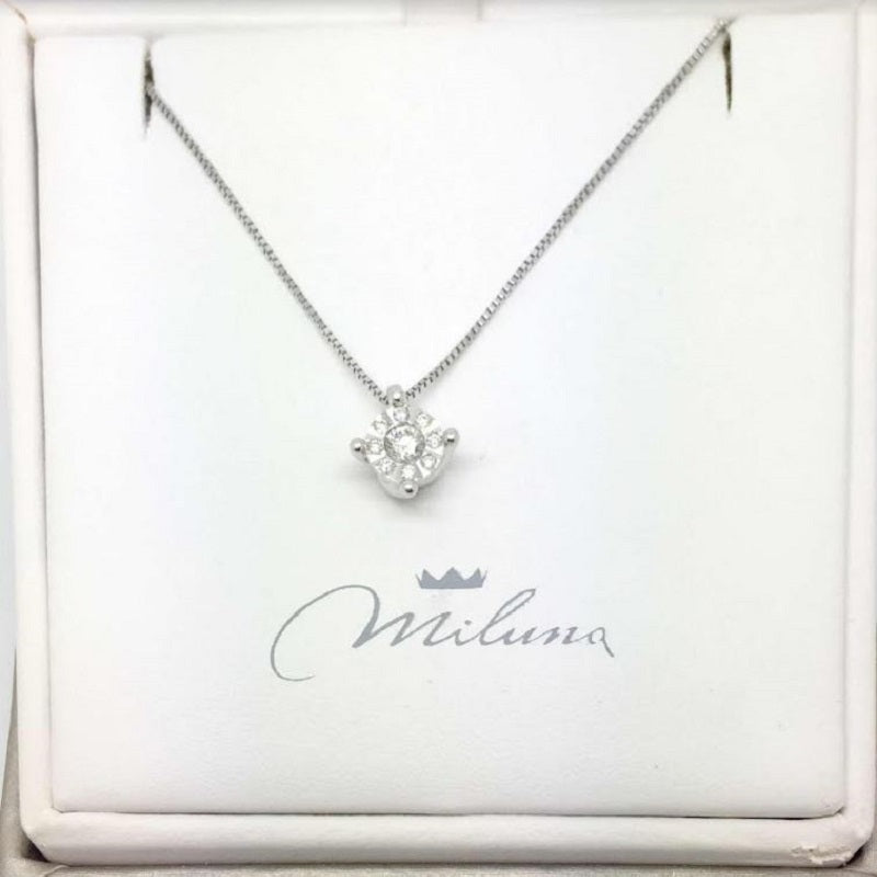 Collana Da Donna Miluna punto luce con Diamante Naturale centrale da 0.12ct più ulteriori 8 Diamanti Naturali a contorno da 0.072ct totali, il tutto montato su oro bianco 18kt. Catenina classica veneziana.