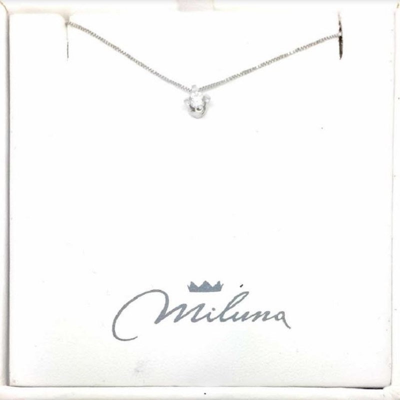 Collana da donna in oro bianco 18 kt Miluna, modello Punto Luce. Ciondolo in oro bianco 18KT, impreziosito da un diamante naturale, taglio brillante rotondo, ct 0.09, colore G, purezza SI. Catenina modello Veneziana.