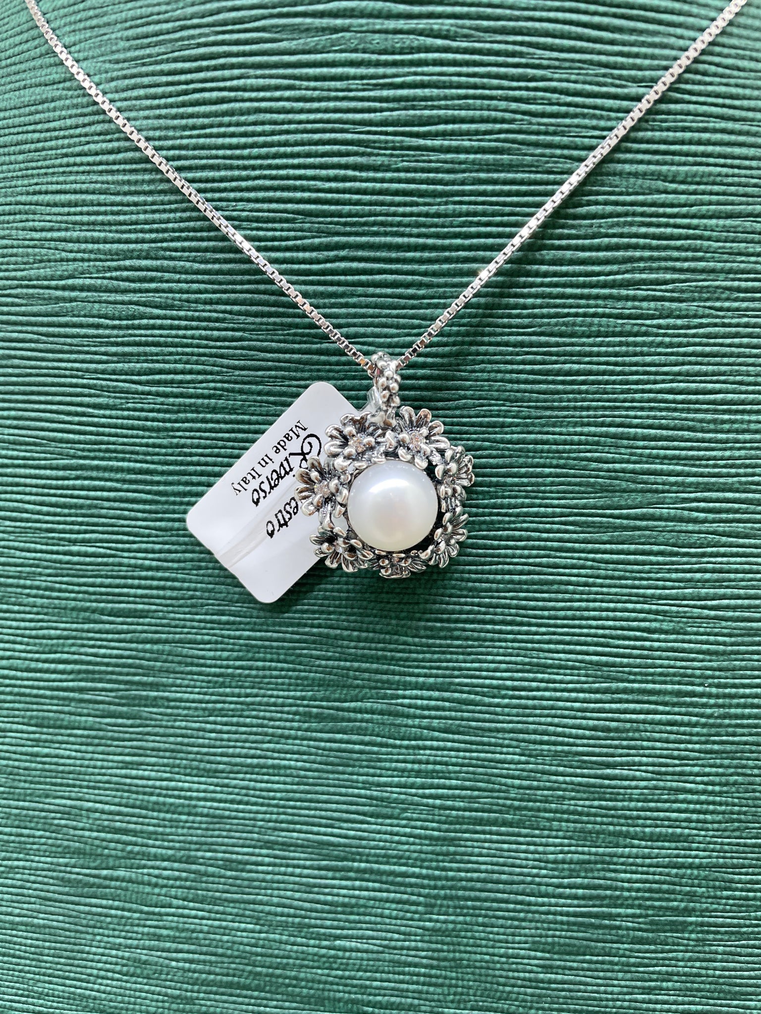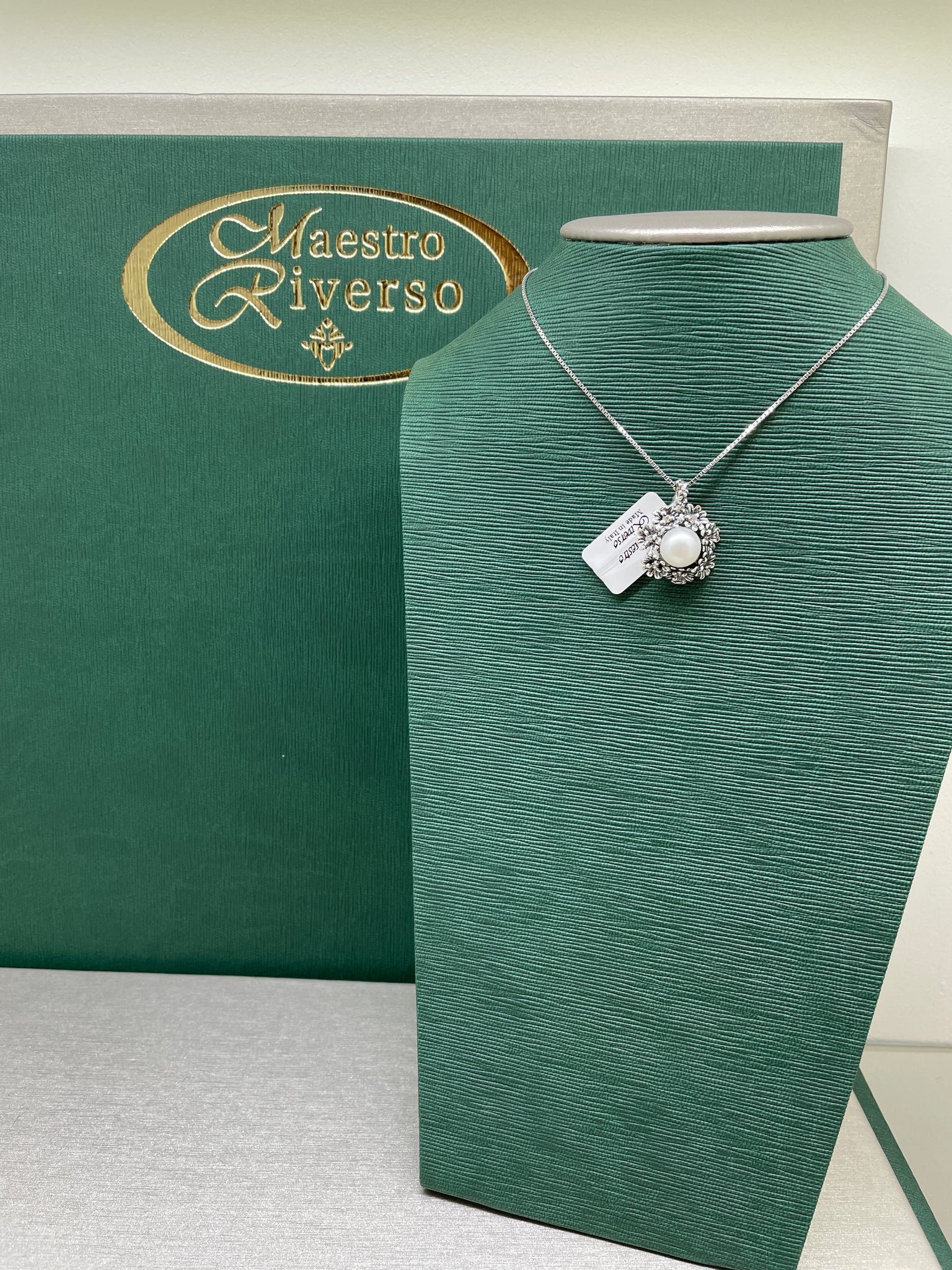 Maestro Riverso. Gioiello in Argento 925/000 e zirconi e cristalli. Realizzato a mano in Italia ed è corredato di Garanzia e Certificato di Autenticità. Dimensioni diametro 2 cm Pietre Zirconi Numero Pietre 8 Perla Centrale 10 mm Catena VENEZIANA 45 cm.