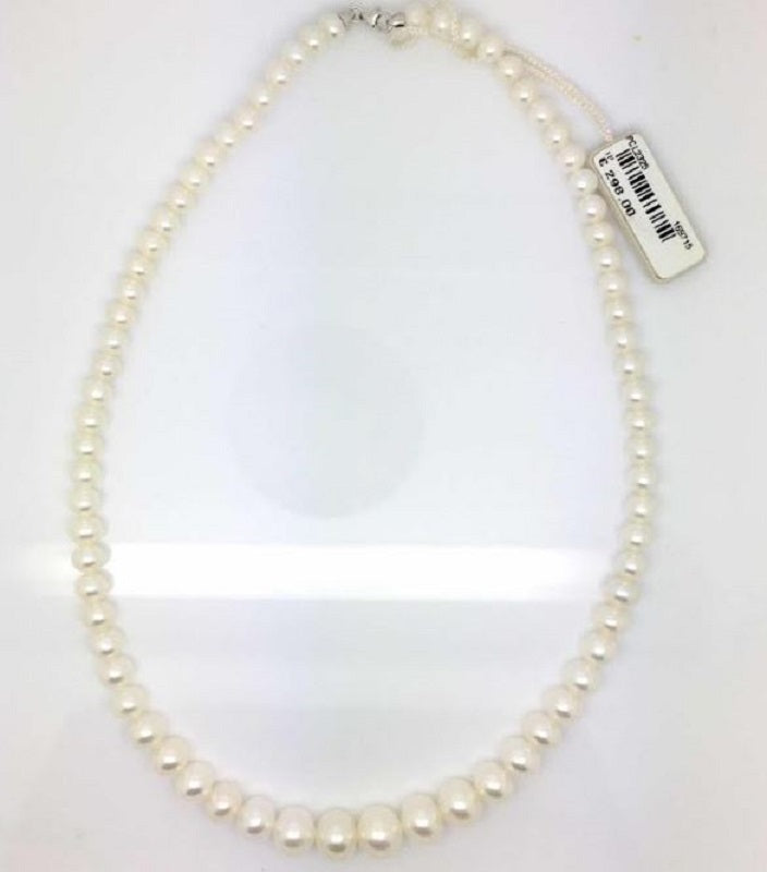 Collana perle bianche a scalare. Moschettone di chiusura oro bianco 750/1000. Perla colore bianco. Diametro da 5-10 mm