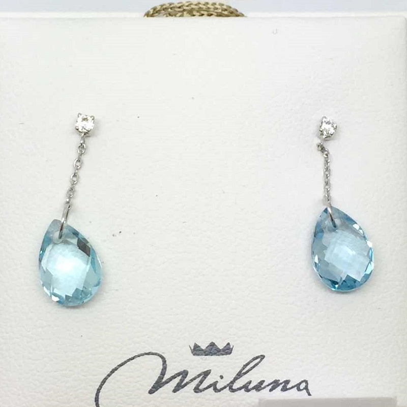 Orecchini Da Donna In Oro Bianco Collezione Gemma del Cielo Miluna, Realizzati in oro bianco 18kt. Pietra Topazio azzurro naturale con forma a goccia da 10 mm x 7 mm taglio briolette. Impreziositi con topazio bianco naturale. Chiusura a farfallina in oro bianco 18kt.