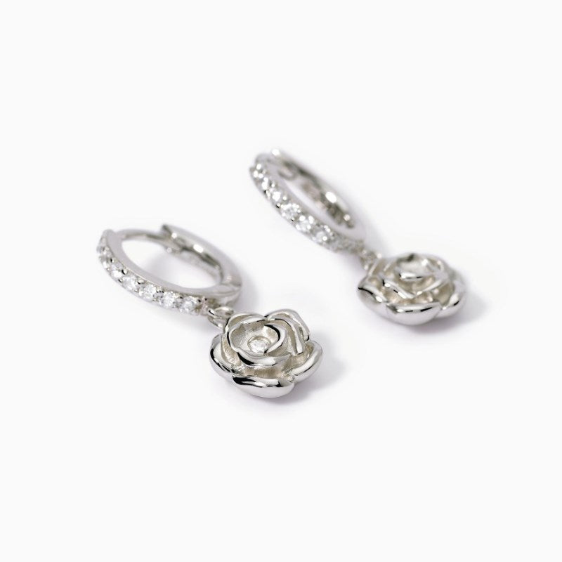 Orecchini a cerchio con pendente a forma di rosa con petali satinati e punto luce all'interno per conferire luminosità al gioiello. Diametro zirconi: 1.75 mm. Materiale: Argento 925 dorato, Zirconi bianchi.