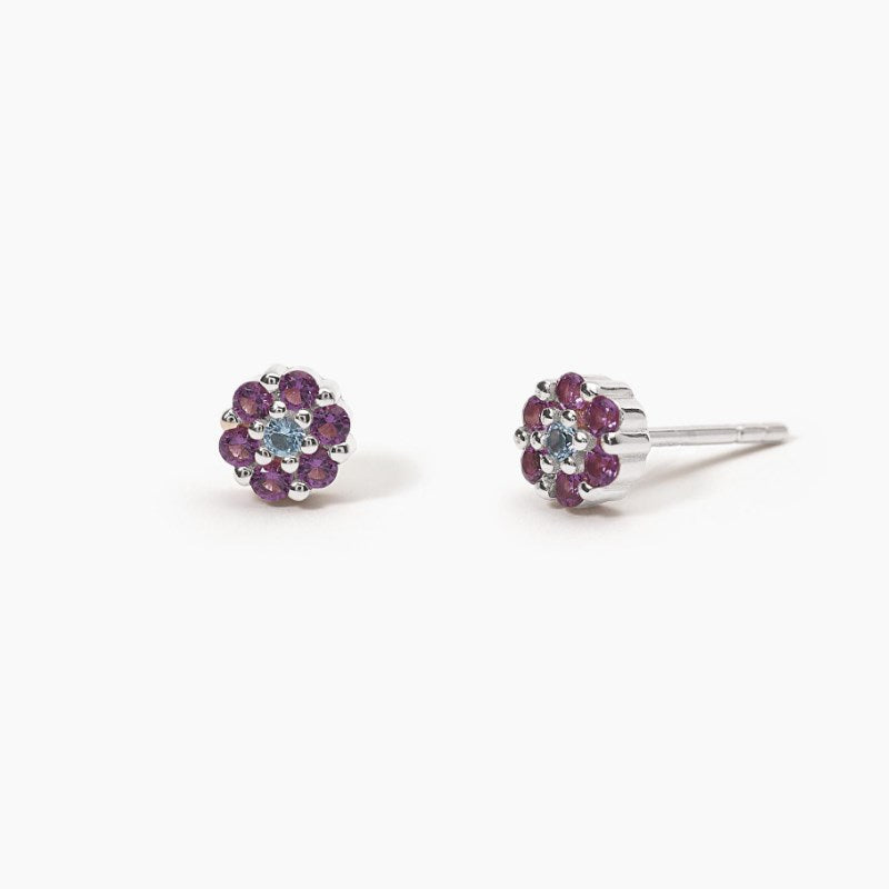 Orecchini a lobo in argento a forma di fiore bicolore con zirconi azzurri e viola. Incastonatura degli zirconi a griffe. Diametro degli zirconi: 1.75 mm. Materiale: Argento 925, Zirconi azzurri e viola.