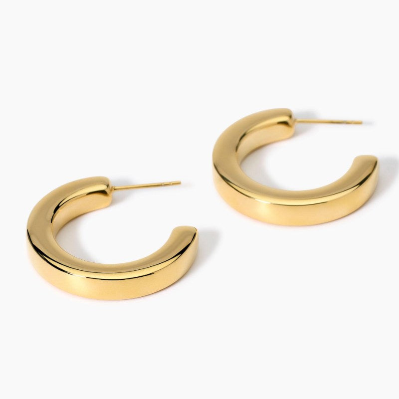 Orecchini a cerchio piatti in acciaio dorato. Collezione Style 09. Diametro esterno: 29 mm. Diametro interno: 19,5 mm. Materiale: Acciaio 316L.