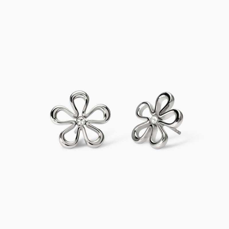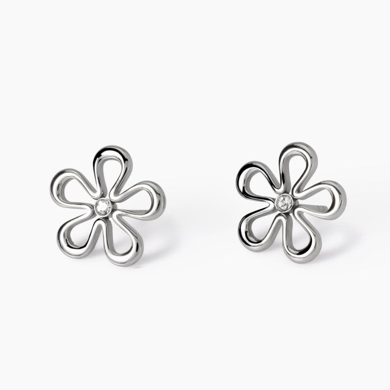 Orecchini a lobo in acciaio a forma di fiore. Collezione Style 17. Dimensione fiore 16,2x16 mm. Diametro cristalli 1,75 mm. Materiale Acciaio 316L.