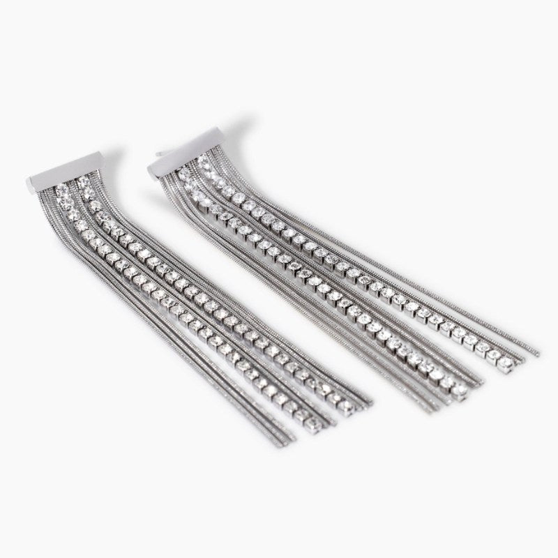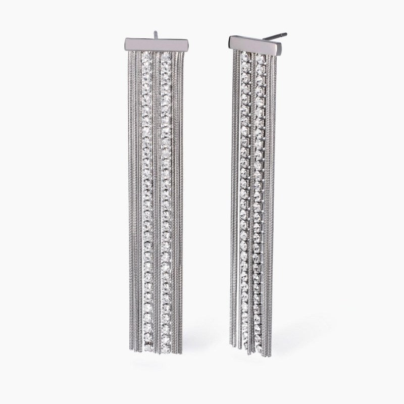 Orecchini pendenti con catena snake e tennis di cristalli bianchi. Collezione Style 02. Lunghezza orecchino: 10,5 cm. Larghezza orecchino: 1 mm. Diametro cristalli: 2 mm. Materiale: Acciaio 316L, Cristalli.