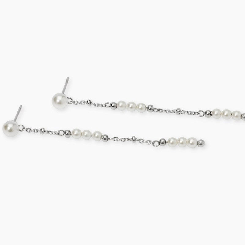 Orecchini in acciaio con perle conchiglia a lobo e catena rolò, sfere e perle conchiglia. Collezione style 32. Diametro sfere: 2 mm. Diametro perle conchiglia: 3 e 5 mm. Lunghezza totale dell'orecchino: 6 cm. Materiale: Acciaio 316L, Perle conchiglia.