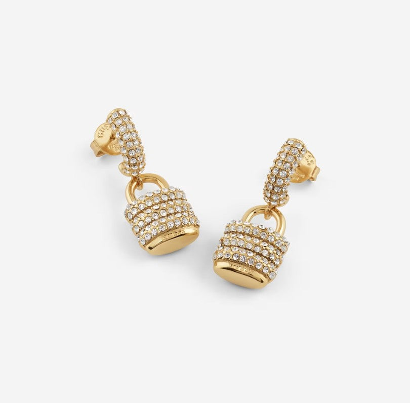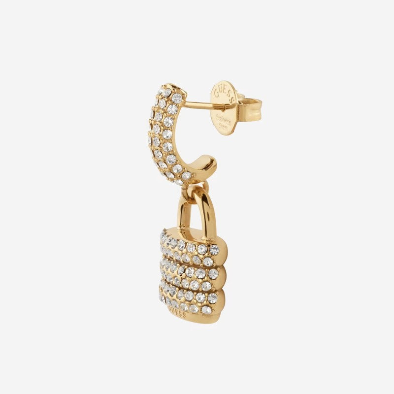Orecchini da donna in acciaio inossidabile dorato e cristalli Guess. Modello a pendente. Charm a forma di lucchetto con pavé. Cristalli applicati. Dettaglio logo inciso. Chiusura a farfalla. Lunghezza totale degli orecchini 2,7 cm.
