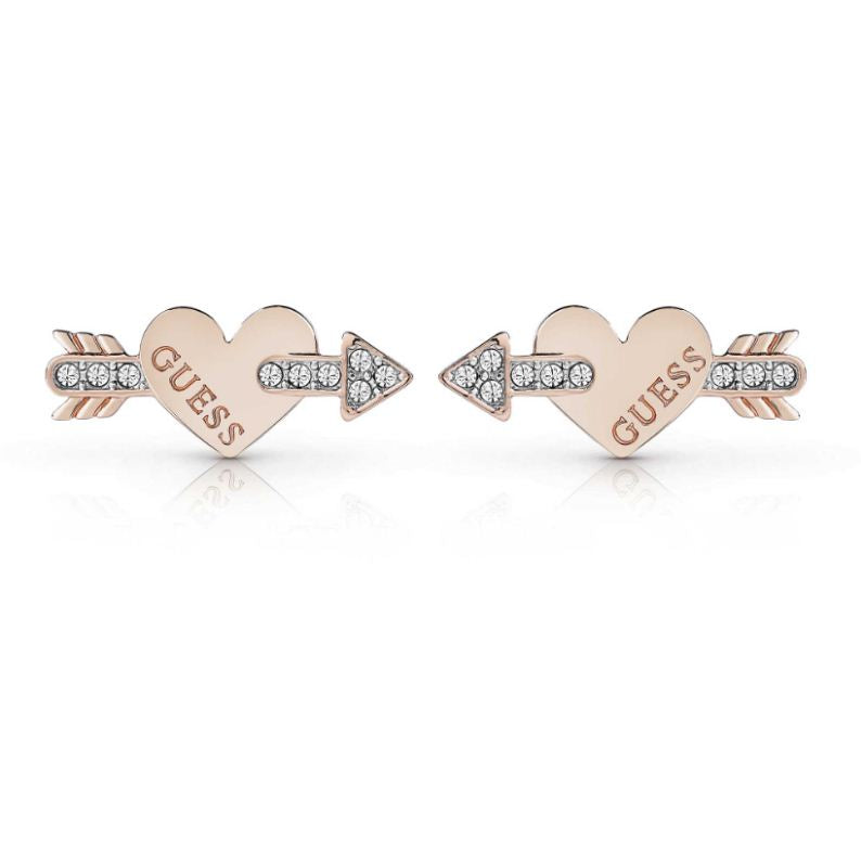 Orecchini Da Donna Guess In Acciaio Bicolore Con Cuore E Freccia Con Cristalli. Chiusura Orecchini Farfallina.