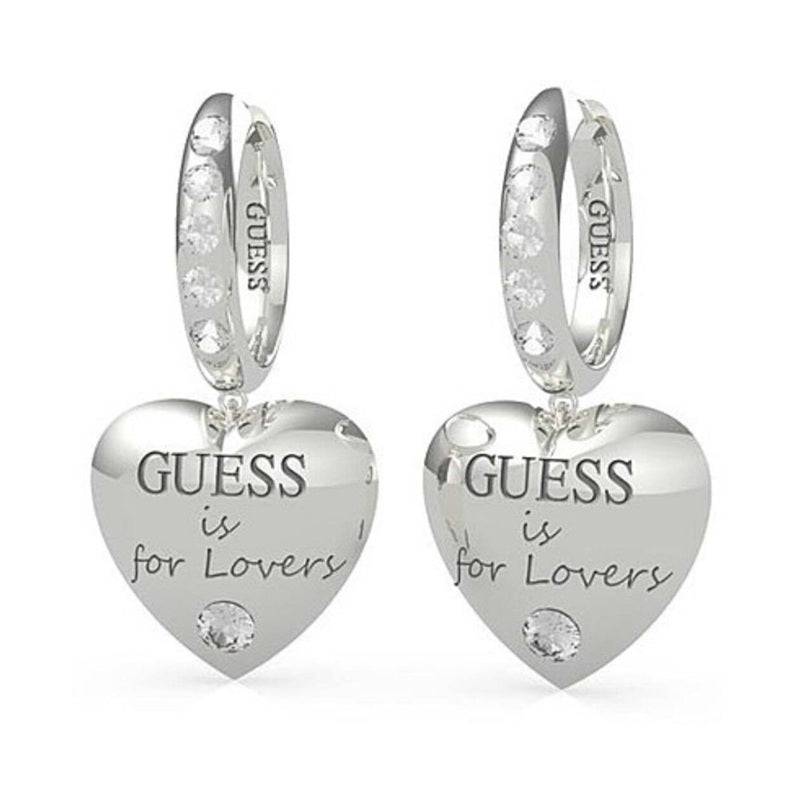 Orecchini Da Donna Di Guess Della Collezione Guess Is For Lovers. Gioiello Realizzato In Acciaio 316L Color Argento Con Logo Guessa Cuore Con Brillanti.