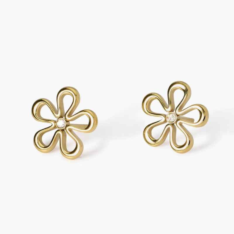 Orecchini a lobo in acciaio dorati a forma di fiore. Collezione Style 17. Dimensione fiore 16,2x16 mm. Diametro cristalli 1,75 mm. Materiale Acciaio 316L, PVD giallo.