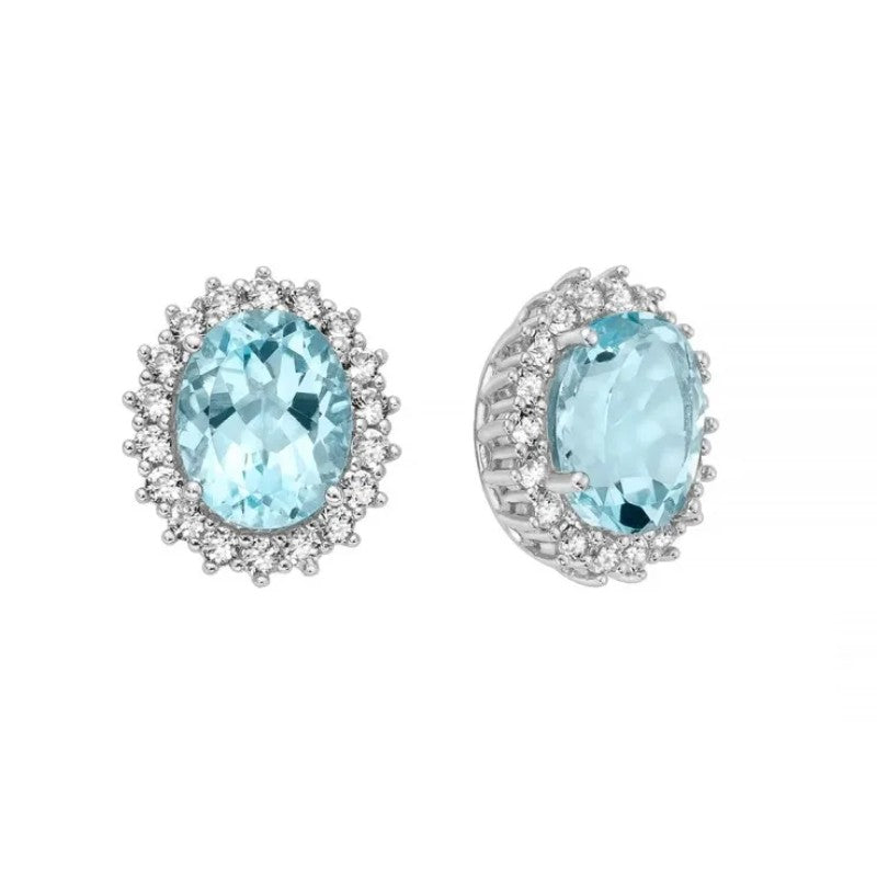 Orecchini da Donna Miluna della collezione Gemma del Cielo 925 realizzato in argento 925 con placcatura rodio silver. Gli orecchini, modello al lobo, sono valorizzati al centro da due topazi azzurri naturali taglio ovale per una caratura complessiva di 6,48 ct ed impreziositi da un contorno di trentasei topazi bianchi naturali taglio tondo 1,75 mm. Chiusura a perno con farfallina.