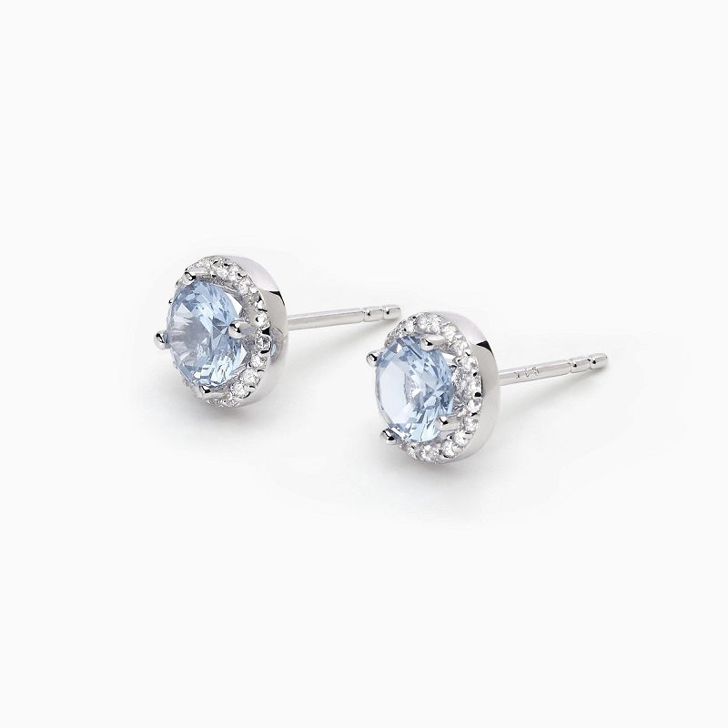 Orecchini da donna in argento rodiato a lobo con acquamarina sintetica circondata da zirconi bianchi. Incastonatura acquamarina sintetica a griffe a quattro punte. Diametro acquamarina sintetica: 6 mm. Diametro degli zirconi: 9 mm. Materiale: Argento 925, Acquamarina sintetica, Zirconi