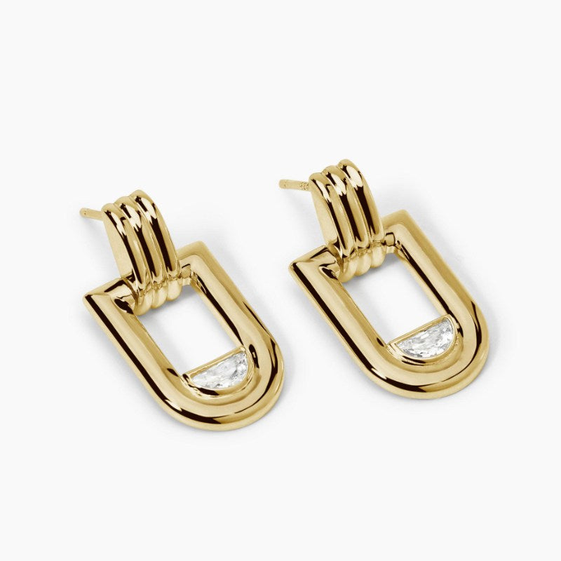 Orecchini da donna in argento dorato con zirconi mezzaluna. Dimensione orecchini: 14x26,8 mm. Dimensione zirconi: 6x3 mm. Materiale: Argento 925, Zirconi. Finitura: Placcatura oro 18K.