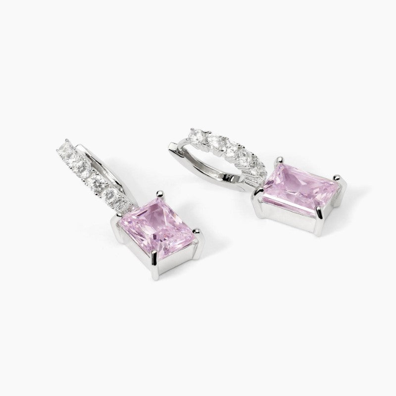 Orecchini da donna in argento rodiato con zircone rosa taglio princess e zirconi bianchi. Dimensione zircone rosa 5 x 7 mm. Diametro zirconi bianchi 2,2 mm. Diametro esterno del cerchio 13 mm. Lunghezza tot. orecchino: 2,4 cm. Materiale Argento 925, Zirconi.