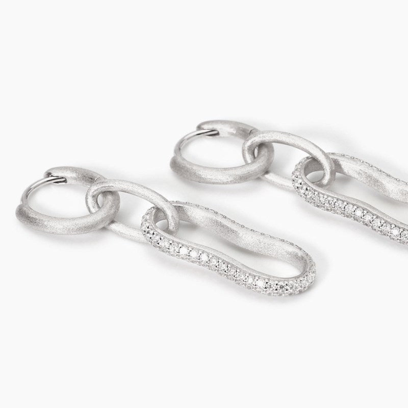 Orecchini a cerchio in argento rodiato bulinato con pendenti in zirconi bianchi. Dimensione pendenti: 9,8x2,4 mm. Diametro zirconi: 1,25 mm. Lunghezza totale dell'orecchino: 4,3 cm. Materiale: Argento 925, Zirconi.
