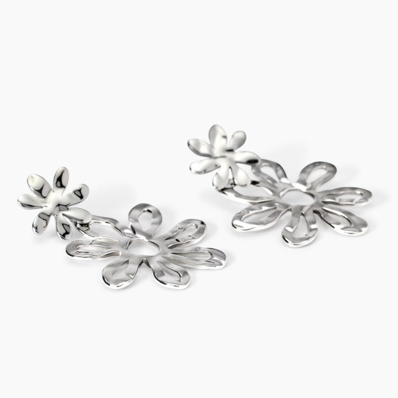 Orecchini pendenti in acciaio con fiori effetto martellato. Collezione style 16. Dimensione fiore piccolo 15x15 mm. Dimensione fiore grande 30x31 mm. Lunghezza totale dell'orecchino 4,5 cm. Materiale Acciaio 316L.