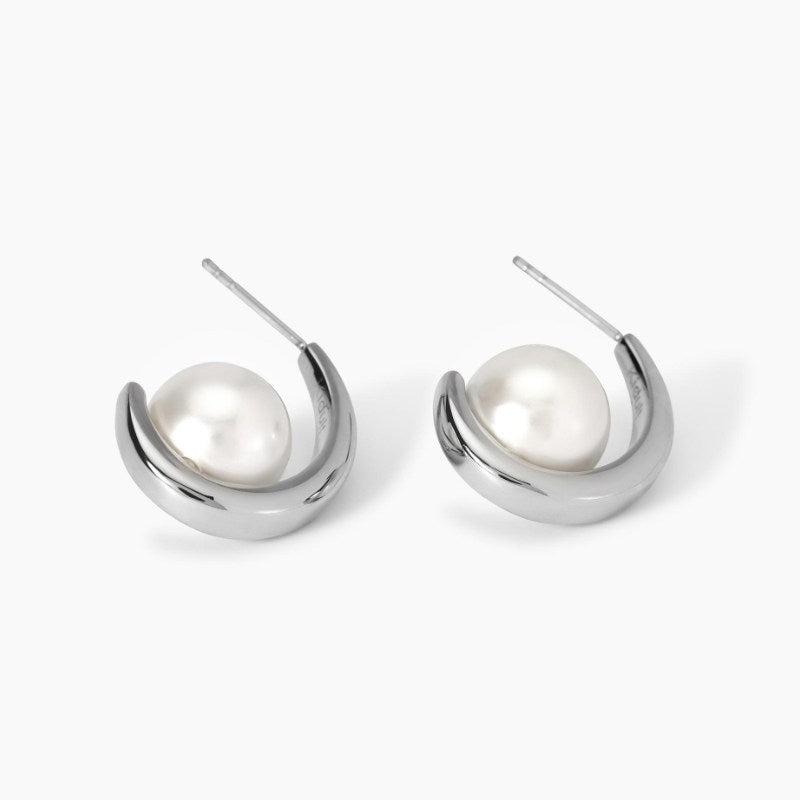 Orecchini semicerchio in acciaio e perle conchiglia. Collezione Style 09. Dimensione orecchino 12x25 mm. Dimensione perla conchiglia 12 mm. Materiale Acciaio 316L.