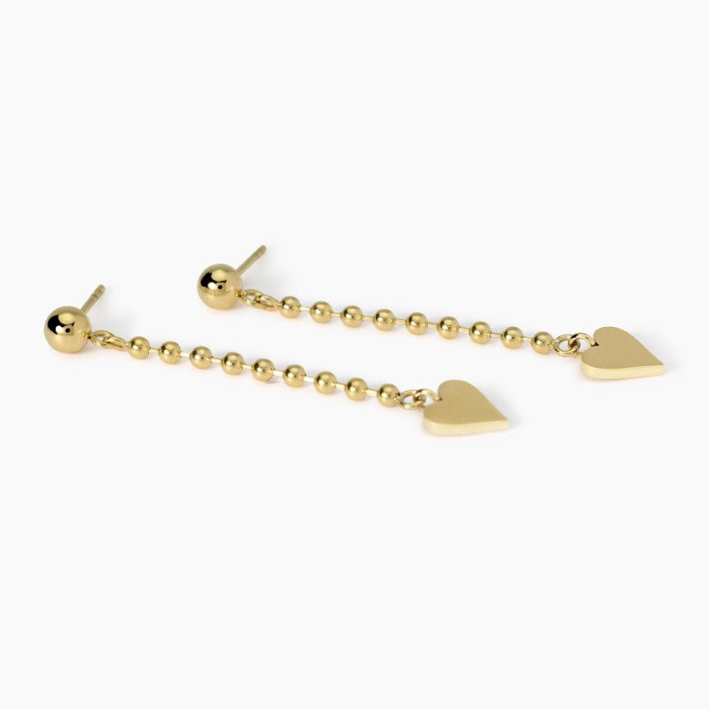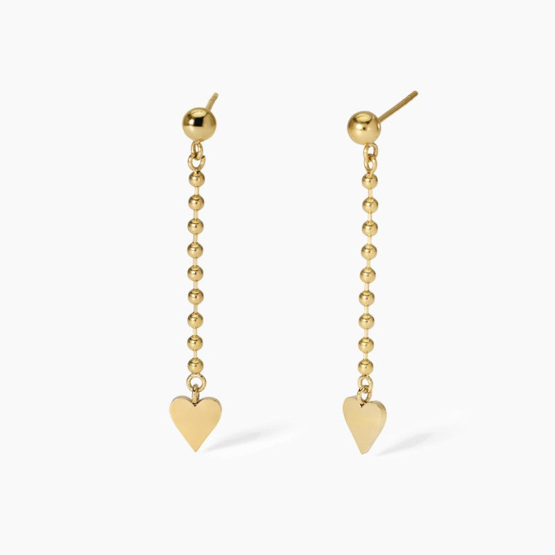 Orecchini pendenti in acciaio dorato con catena a sfere e cuori. Collezione Style 18. Dimensione catena 2,5 mm. Diametro sfere 5 mm. Dimensione cuori 8x8,6 mm. Lunghezza totale dell'orecchino 5 cm. Materiale Acciaio 316L.