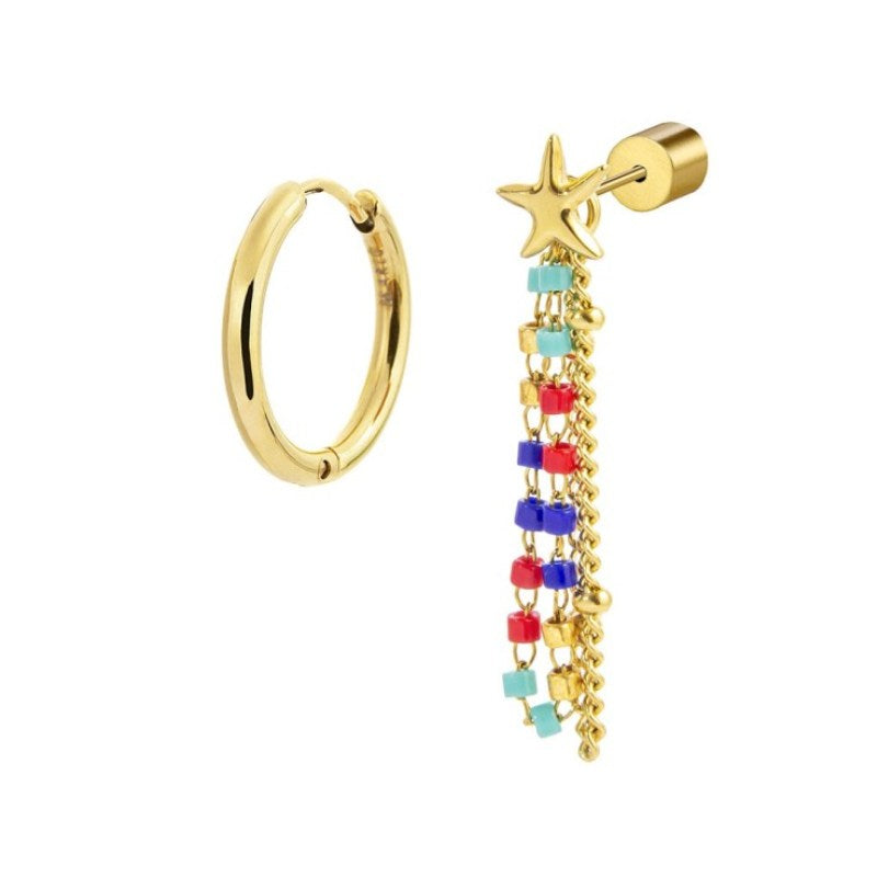 Mono orecchino "multindosso" a cerchio con diametro 1,6 cm, la chiusura è a pressione. Il pendente con doppia catena è removibile: la prima è una catena a grumetta con sfere in acciaio. La seconda è composta da miyuki. Mono orecchino removibile a forma di stella marina nella parte inferiore del pendente. Lunghezza totale 7 cm.