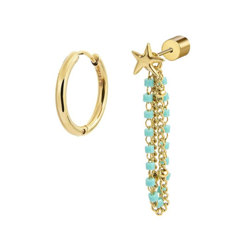Mono orecchino "multindosso" a cerchio con diametro 1,6 cm, la chiusura è a pressione. Il pendente con doppia catena è removibile: la prima è una catena a grumetta con sfere in acciaio. La seconda è composta da miyuki. Mono orecchino removibile a forma di stella marina nella parte inferiore del pendente. Lunghezza totale 7 cm.