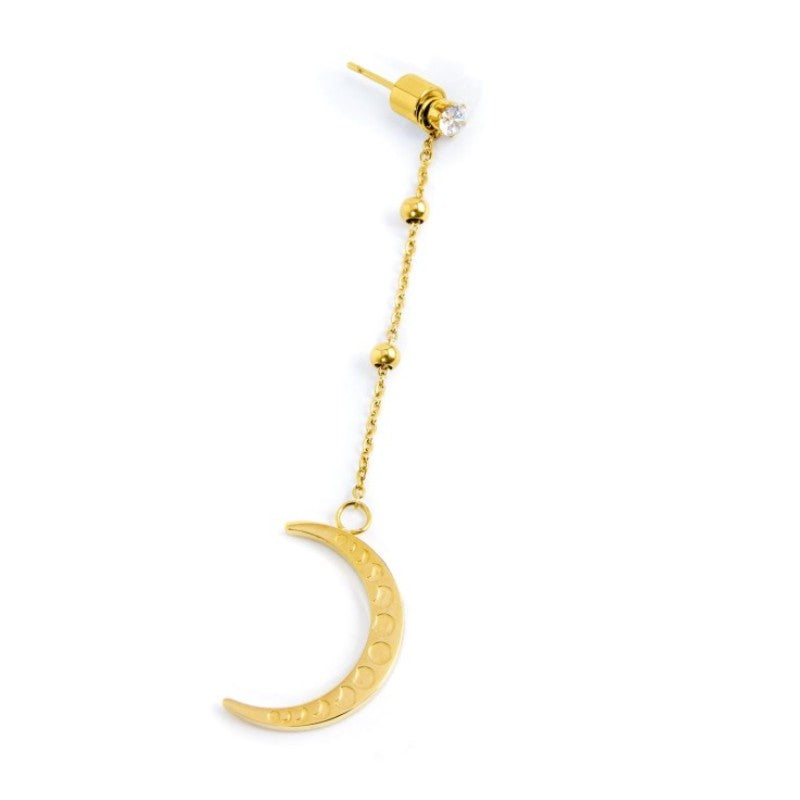 Mono orecchino da donna in acciaio dorato con cubic zirconia bianco e con catena cross con sfere in acciaio. Pendente removibile con luna con conchiglia bianco madreperla. Lunghezza totale 5,9 cm.