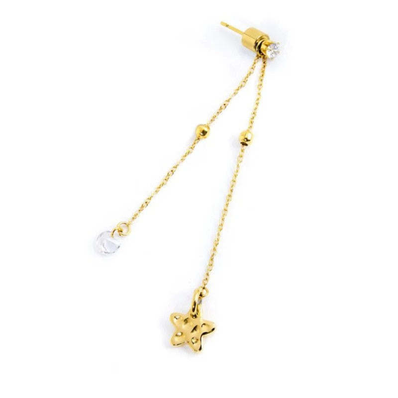 Orecchino pendente da donna in acciaio dorato stella e zircone. Lunghezza 6 cm. Diametro stella 9mm.