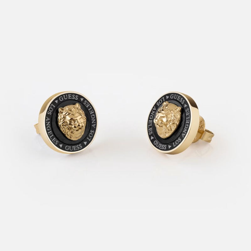 Orecchini da uomo in acciaio dorato Guess. Forma tonda. Charm a forma di leone. Chiusura a farfalla. Dimensioni diametro 14 mm.