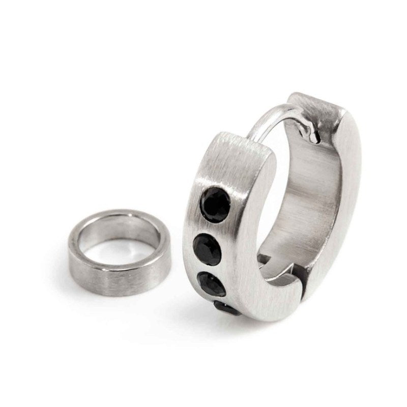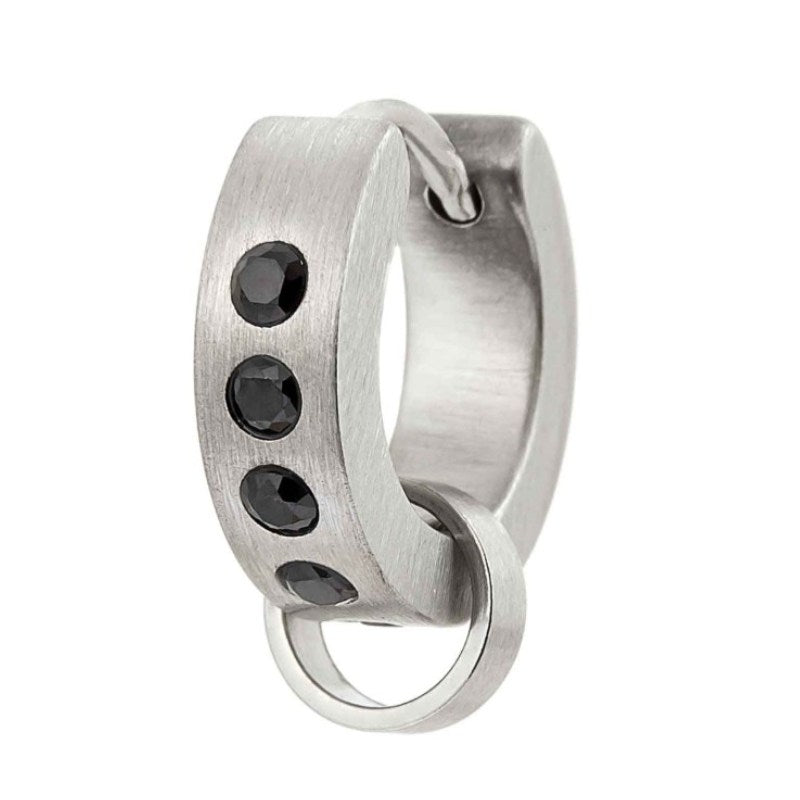 Mono orecchino da uomo a cerchio con cristalli neri, con diametro di 14 mm, con anello removibile per charm, la chiusura è a pressione. Il logo Marlù è presente sul lato.