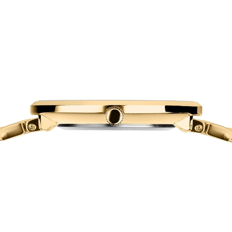 Orologio solo tempo da Donna con movimento al quarzo, cassa 34 mm e cinturino in titanio PVD gold, quadrante bianco e vetro zaffiro piatto antigraffio. Cinturino è in titanio PVD gold con finiture lucide e satinate e monta una chiusura deployante con doppio pulsante. Orologio impermeabile a 5 ATM.