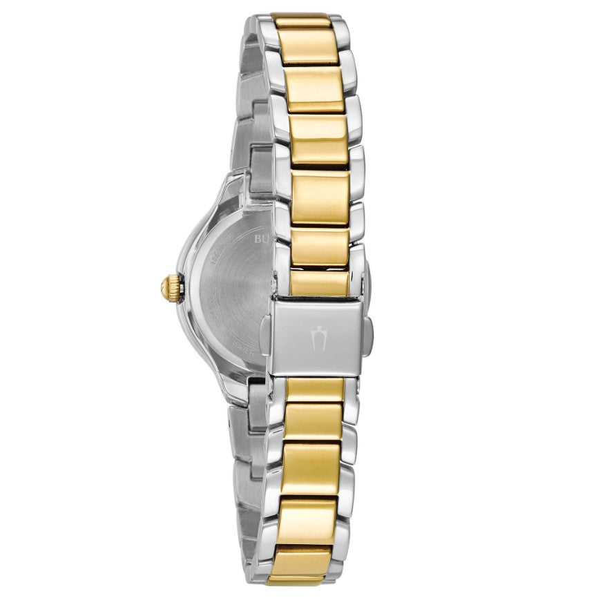 Orologio Solo Tempo Da Donna Bulova collezione Classic Lady. Cassa in acciaio 28 mm, cinturino bicolore in acciaio e oro, quadrante silver, vetro minerale. Resistenza all'acqua 3 Bar.