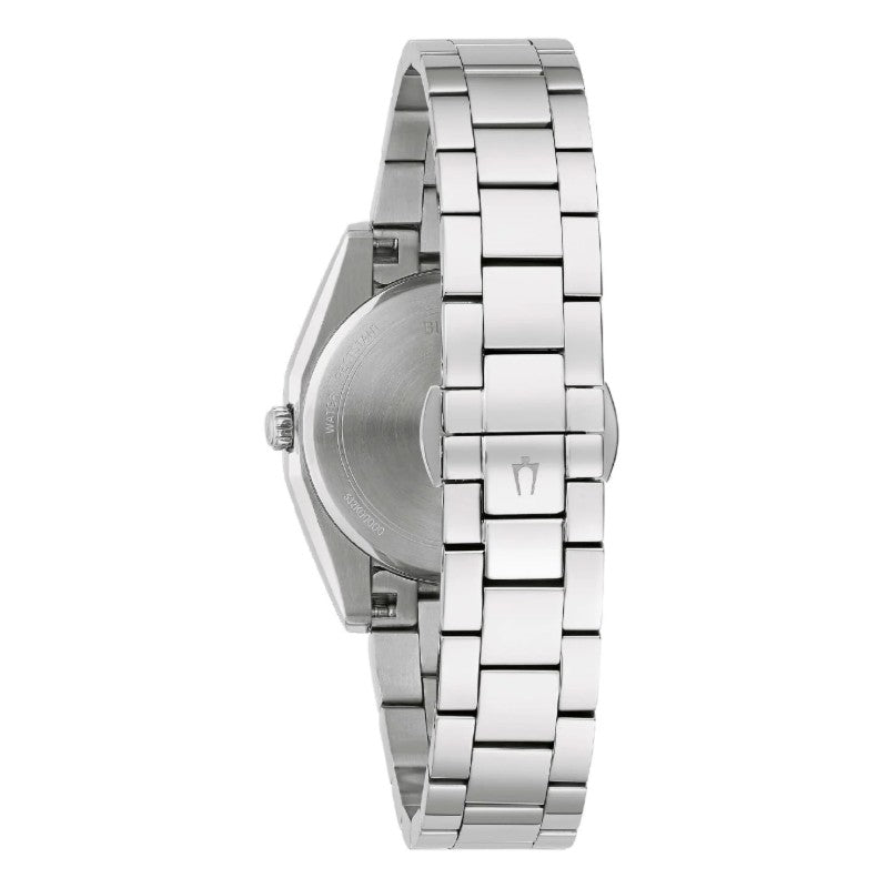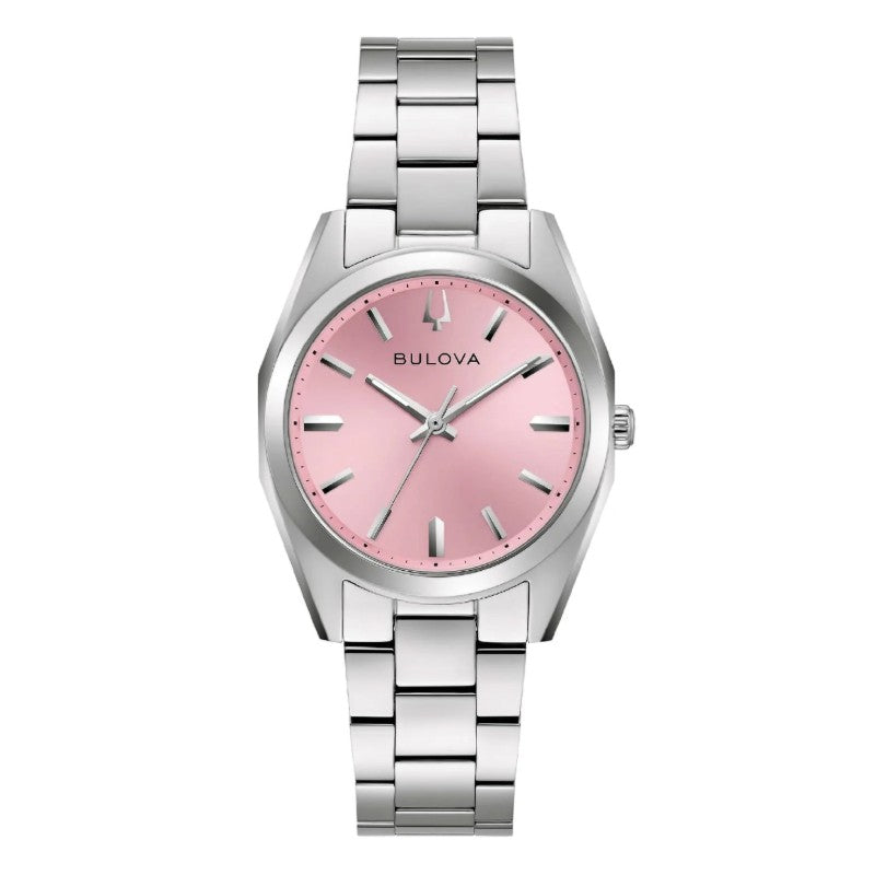 Orologio solo tempo della collezione Bulova Surveyor da donna. Colore cassa: argento; colore del quadrante: rosa; colore del bracciale: argento. Cassa di diametro 31 mm in acciaio inossidabile 316L. Vetro zaffiro. Bracciale in acciaio inossidabile 316L con chiusura deployante con pulsanti. Movimento al quarzo. Classificazione di impermeabilità (WR) 3 ATM