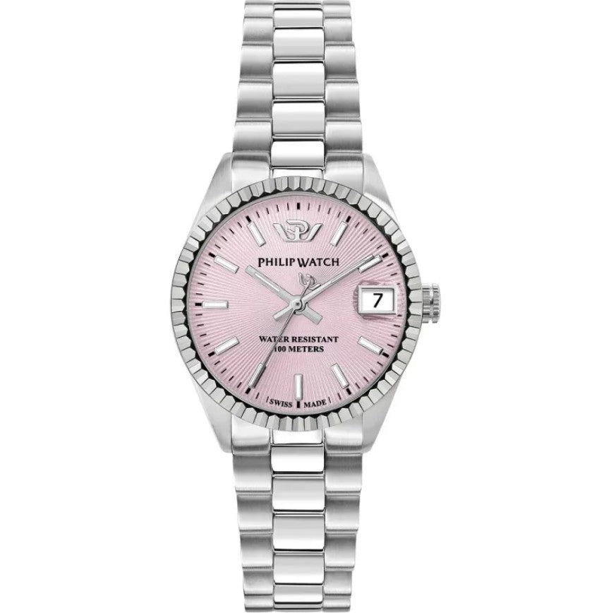 Orologio solo tempo da donna Philip Watch collezione Caribe Lady. Movimento ETA Swiss Made al quarzo. Cassa 31 mm e lunetta con finitura zigrinata in acciaio inox, spessore della cassa 9.15 mm, quadrante analogico rosa guillochè, indici e lancette color oro, datario a finestrella con lente d’ingrandimento ad ore 3, indici e lancette con inserto luminescente in modo che l'ora sia leggibile anche in condizioni di scarsa illuminazione, corona e fondello serrati a vite per una maggiore garanzia di impermeabilità e vetro zaffiro con trattamento antiriflesso. Il cinturino è in acciaio inox con finitura lucida e satinata e monta una chiusura deployante con apertura a doppio pulsante. Orologio impermeabile a 10 ATM.