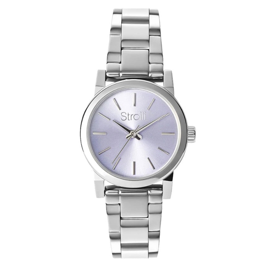 Orologio solo tempo da Donna Stroili Bruxelles. Movimento quarzo, solo tempo. Cassa in acciaio 26 mm argentato. Quadrante lilla, con indici acciaio a bastoni e vetro minerale. Impermeabilità 5 atmosfere. Bracciale in acciaio regolabile argentato.