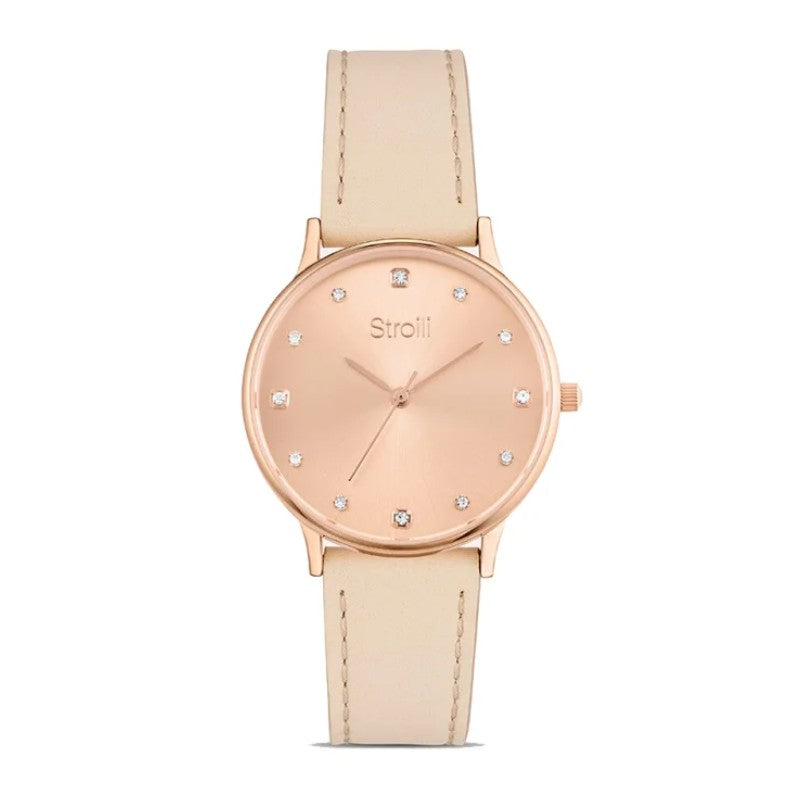 Orologio da donna Stroili della collezione Ibiza. Movimento al quarzo. Cassa in acciaio PVD oro rosa, diametro 32 mm. Cinturino in pelle di colore beige. Quadrante di colore rosa. Resistenza all'acqua 3 atm / 30 metri.