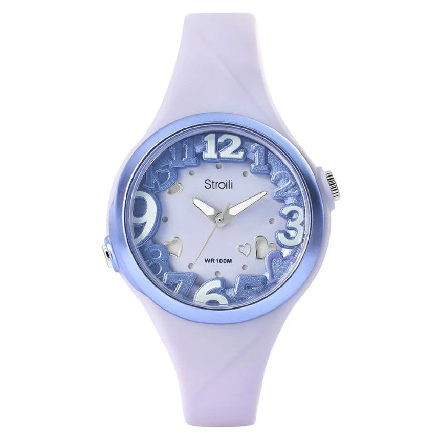 Orologio solo tempo da Donna Stroili Los Angeles. Movimento al quarzo, solo tempo. Cassa in silicone 32 mm viola. Quadrante lilla, con indici acciaio e vetro Acrilico. Impermeabilità: 3 atmosfere. Bracciale in silicone viola.