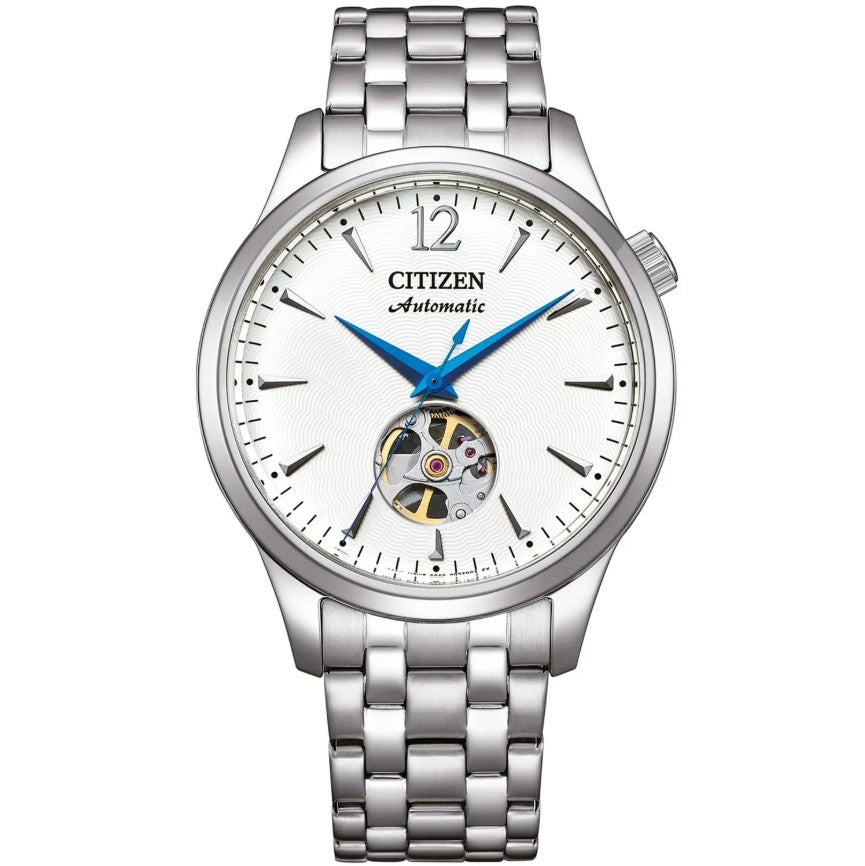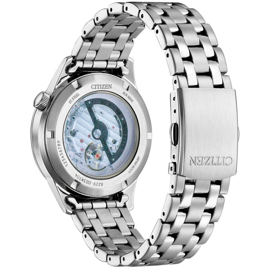 Orologio da polso Citizen per uomo Automatico. Cassa in acciaio di diametro 40 mm. Quadrante di colore bianco con indci e lancette blu, Oblò trasparente con movimento a vista. Bracciale in acciaio. Movimento meccanico a ricarica automatica. Resistente all'acqua (water resistant) 5 atm (50m).