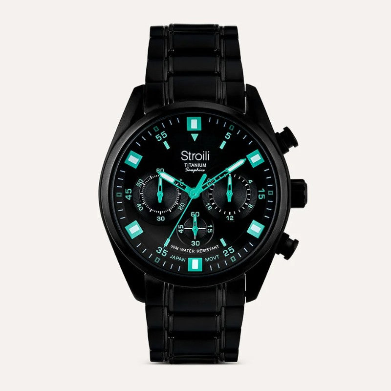 Orologio Cronografo da uomo in Titanio Stroili Bilbao. Cassa in Titanio, Colore nero. Diametro 42. Colore del Quadrante Nero-Verde Movimento Quarzo. Cinturino in Titanio. Colore Cinturino nero. Vetro Minerale. Resistenza all'acqua 50 M / 5 ATM.