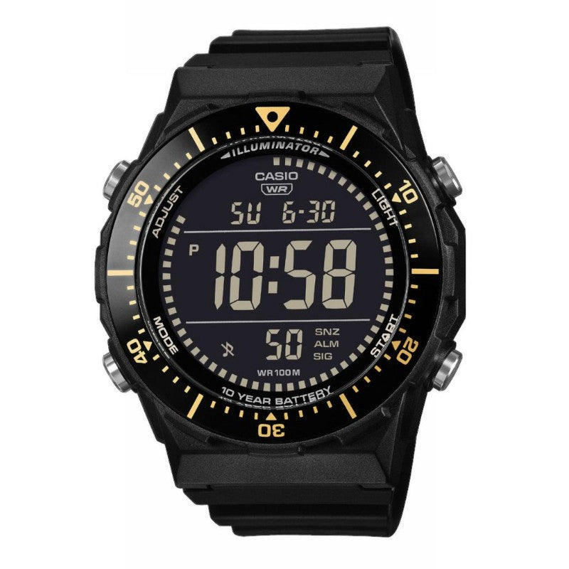 Orologio da uomo Casio. Cassa rotonda da 47 mm di diametro, realizzata in resina nera, display digitale chiaro e di facile lettura. Cinturino, in resina nera. Cristallo in plastica antigraffio Orologio è dotato di un movimento al quarzo. Resistenza all'acqua di 100 m (10 ATM).