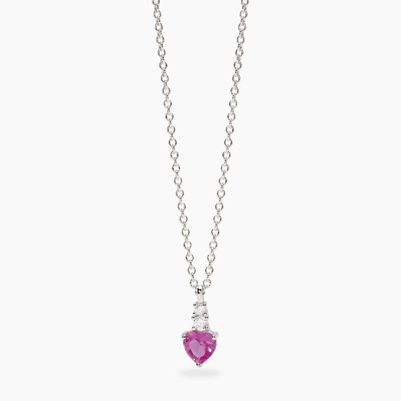 Girocollo regolabile con catena rolò in argento rodiato e pendente con zirconi cuore in corindone rosa sintetico. Dimensione catena rolò: 1,5 mm. Dimensione pendente: 6,7x11,2 mm. Dimensione acquamarina sintetica: 6x6 mm. Dimensione zirconi: 2 e 2,5 mm. Misura regolabile, lunghezza da 39 a 43 cm. Materiale: Argento rodiato 925, Zirconi, Corindone sintetico