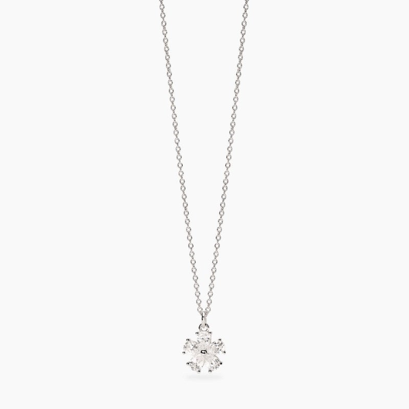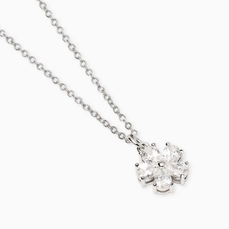 Girocollo regolabile in argento rodiato con catena rolò e pendente fiore in zirconi taglio goccia. Dimensione catena rolò: 1,2 mm. Dimensione pendente: 8,6x8,4 mm. Dimensione zirconi taglio goccia: 2,5x4 mm. Misura regolabile, lunghezza da 40 a 45 cm. Materiale: Argento rodiato 925, Zirconi.