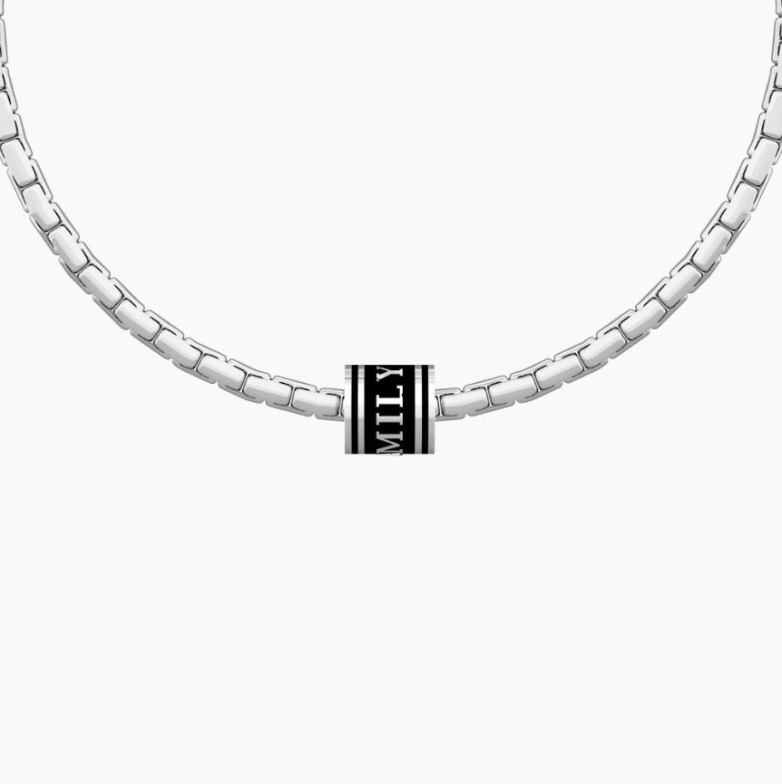 Bracciale regolabile da uomo con catena veneta in acciaio e cilindro nero con scritta "MY FAMILY". Collezione Family. Dimensione catena: 2,6 mm. Dimensione cilindro: 7xØ6 mm. Misura regolabile, lunghezza da 19 a 21 cm. Materiale: Acciaio 316L, Pietre. Immagine indicativa in quanto trattandosi di pietre naturali i colori del bracciale potrebbero variare.
