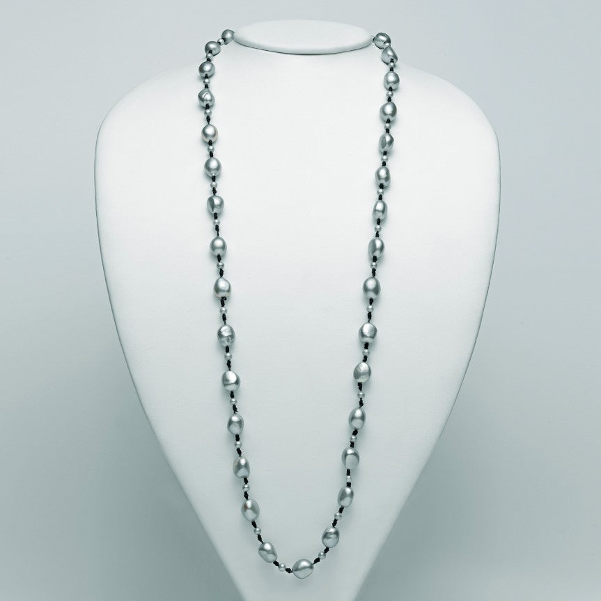 Miluna women's necklace, knot collection, in 925/1000 silver, fl 1, 43 oriental baroque pearls col. white 11-12, fl 0, 55 pearls lr col. white 5-5, 5, white cotton thread.