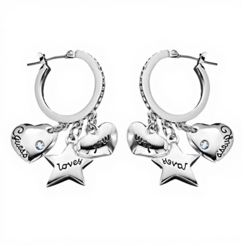 Orecchini donna a cerchio con strass e tre pendenti: due cuori e una stella con incisioni e strass.